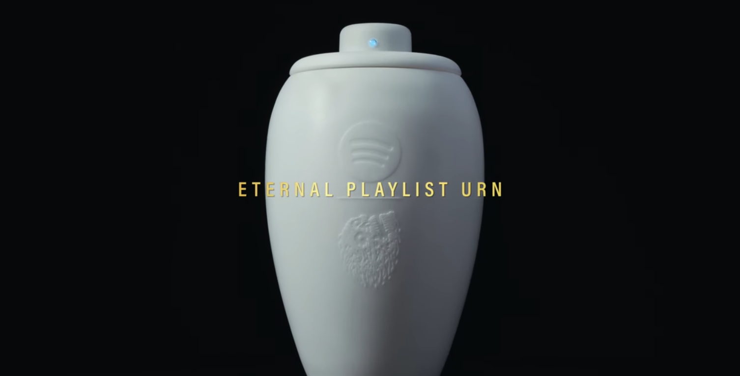 Isso porque a Eternal Playlist Urn (Urna da Playlist Eterna) possui Bluetooth para reproduzir música e, acompanhada por um Gerador de Playlist Eterna desenvolvido pelo Spotify, permite que as pessoas criem uma playlist personalizada que será sincronizada com a urna para o falecido. Além disso, de acordo com a Liquid Death, pesquisas mostram que manter os mortos felizes reduz em 47% a probabilidade de eles assombrarem você.