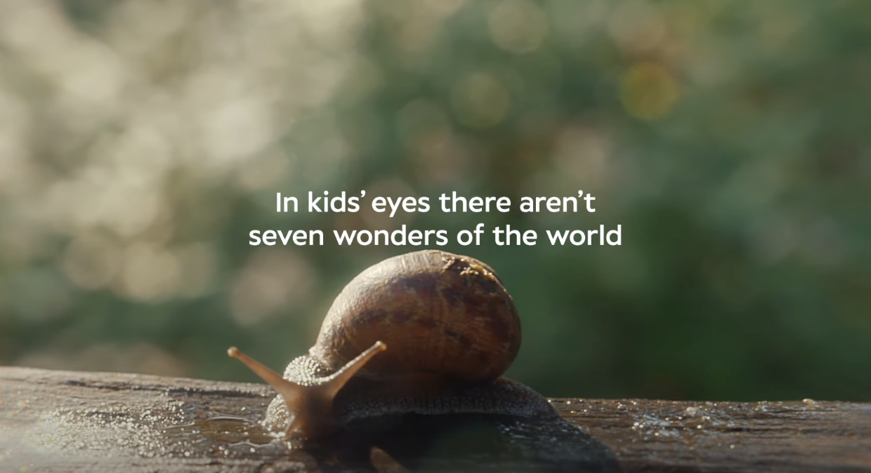 O comercial principal, dirigido por Dan Emerson pela produtora Somesuch, compartilha com o público a admiração adulta pela maneira como as crianças enxergam o mundo. Filmada da perspectiva de uma criança com imagens no estilo GoPro, a campanha captura o deleite das crianças ao verem maravilhas do cotidiano, como um caracol, formigas, limões mofados, bolhas gigantes, tsurus voando e até mesmo um rosto em um ralador de queijo.