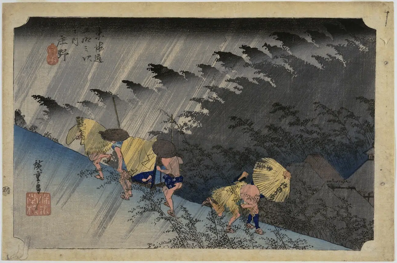 Intitulada Rising Sun, Falling Rain (Sol Nascente, Chuva Caindo), a mostra oferece um olhar aprofundado sobre a evolução da gravura ukiyo-e e o movimento shin-hanga, que revitalizou o ukiyo-e tradicional no início do século XX no Japão. O período Edo foi caracterizado por uma significativa transformação cultural. Ele surgiu após o período Sengoku, durante o qual guerras civis e convulsões sociais ocorreram ao longo dos séculos XV e XVI.
