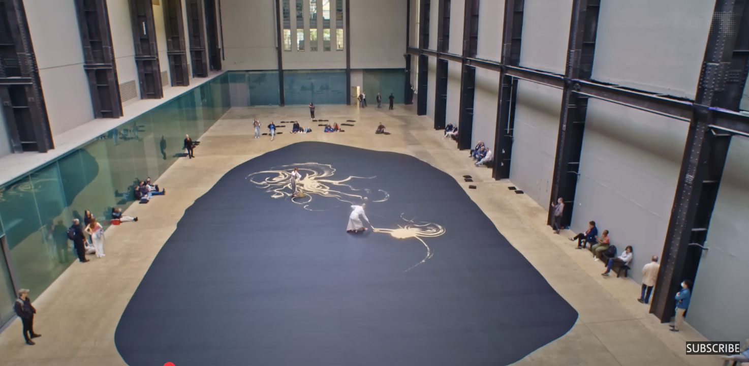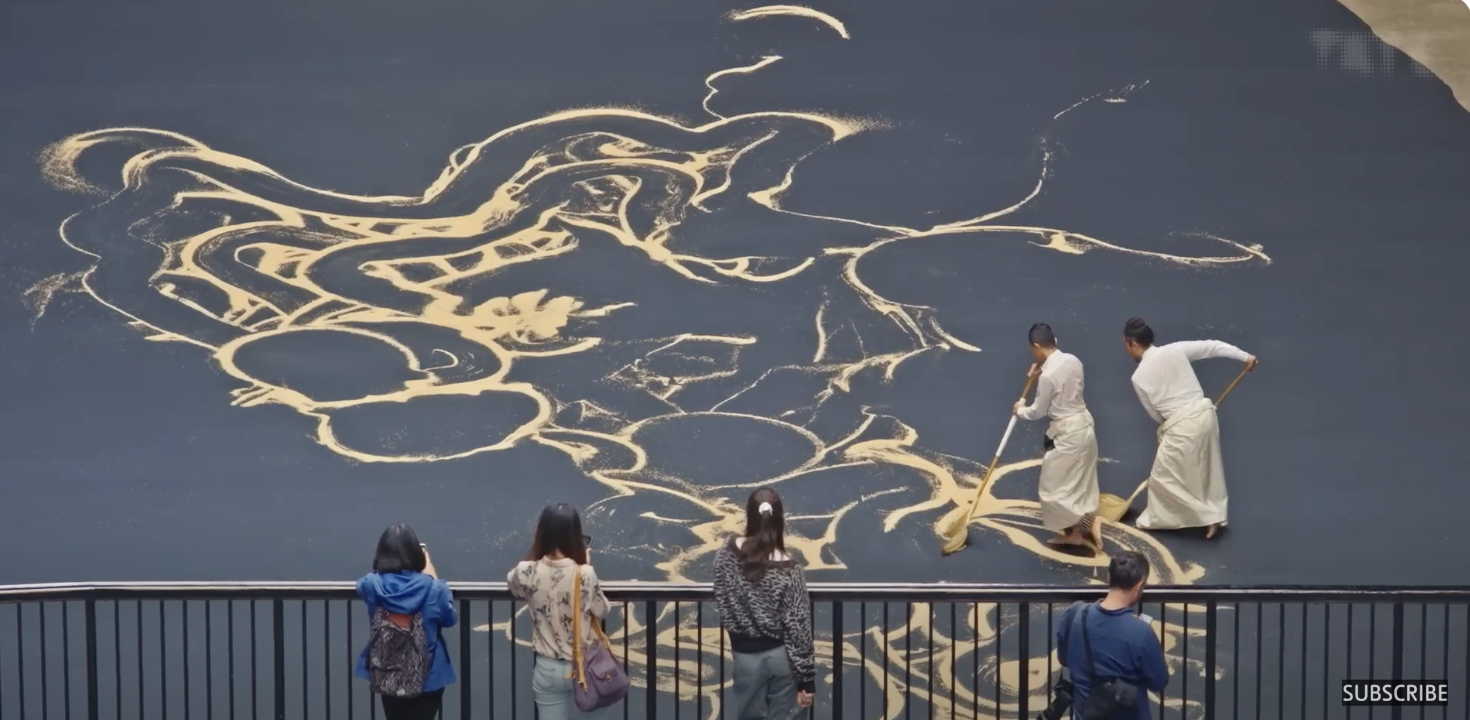Além dos movimentos ou gestos das dançarinas, muitos aspectos são cuidadosamente selecionados. Os trajes consistem em camisas sociais brancas e sarongues feitos de sedas adquiridas por Mingwei durante suas visitas ao Japão. Os artistas também usam sinos de tornozelo da Índia, que, para Mingwei, ressoam como “gelo rachando” ao deslizarem pelo chão. As vassouras também foram meticulosamente selecionadas pelo artista: “Elas são muito volumosas e macias para permitir fluidez e movimento”. Vale conhecer aqui mais sobre o artista.