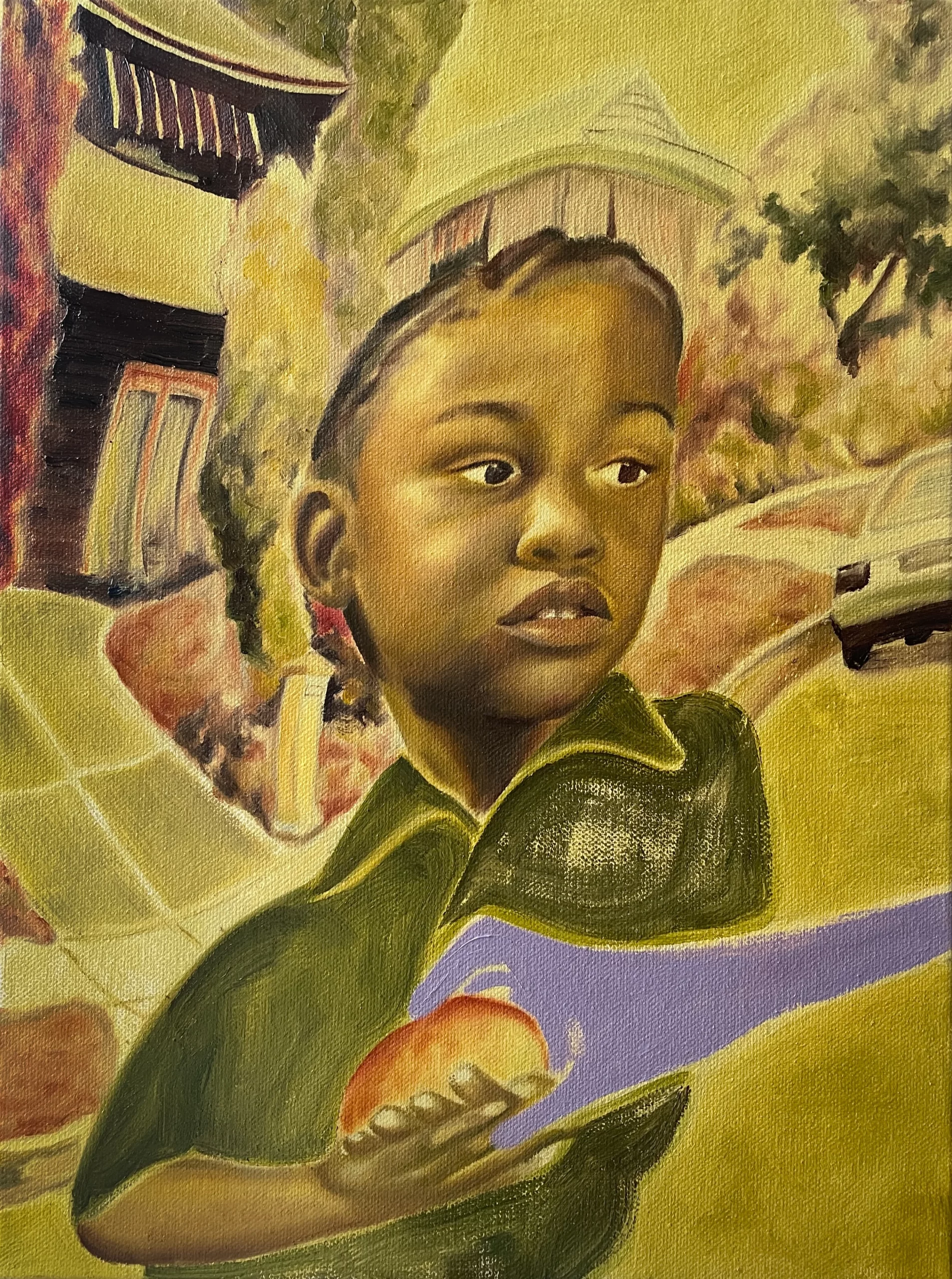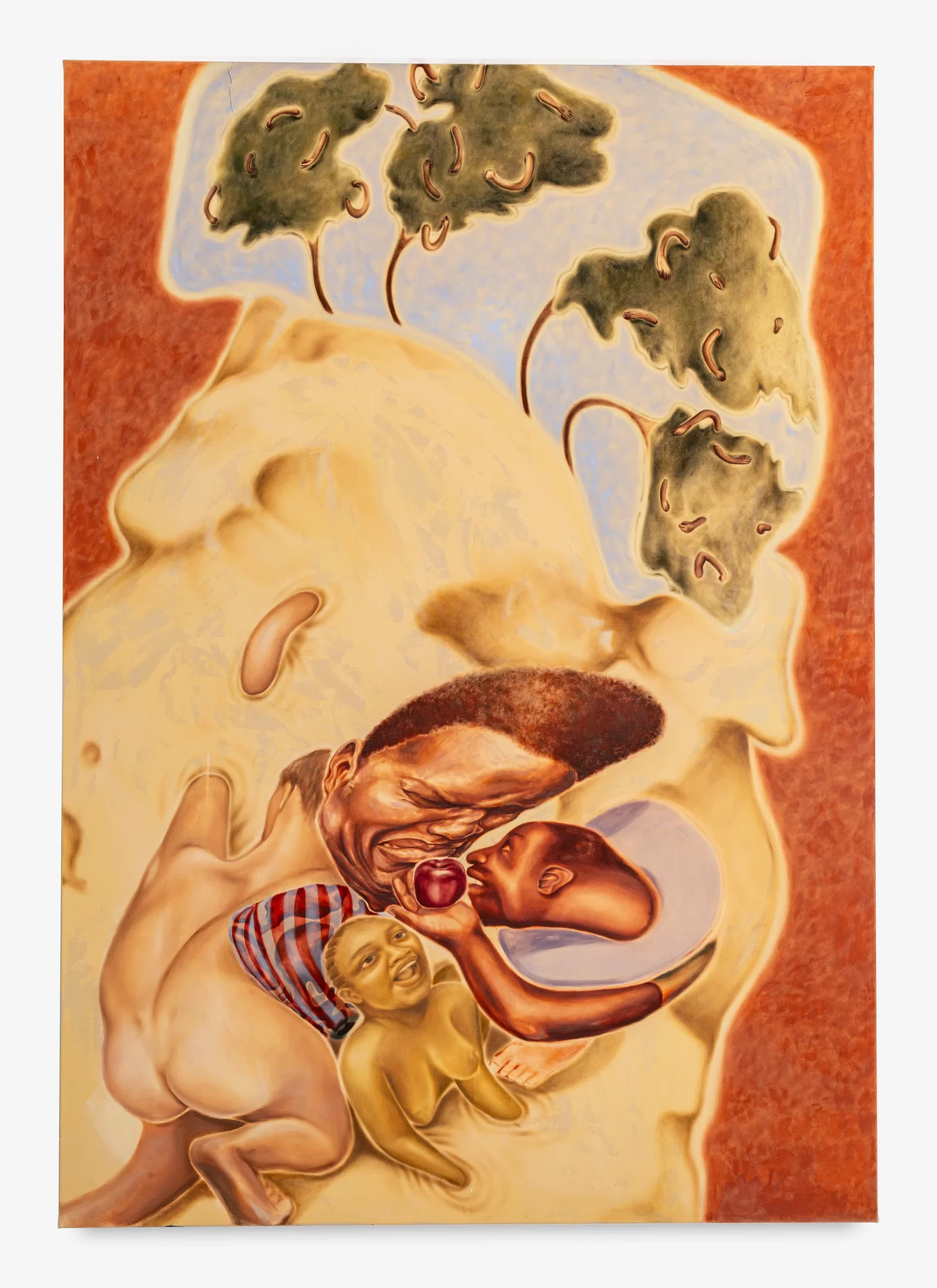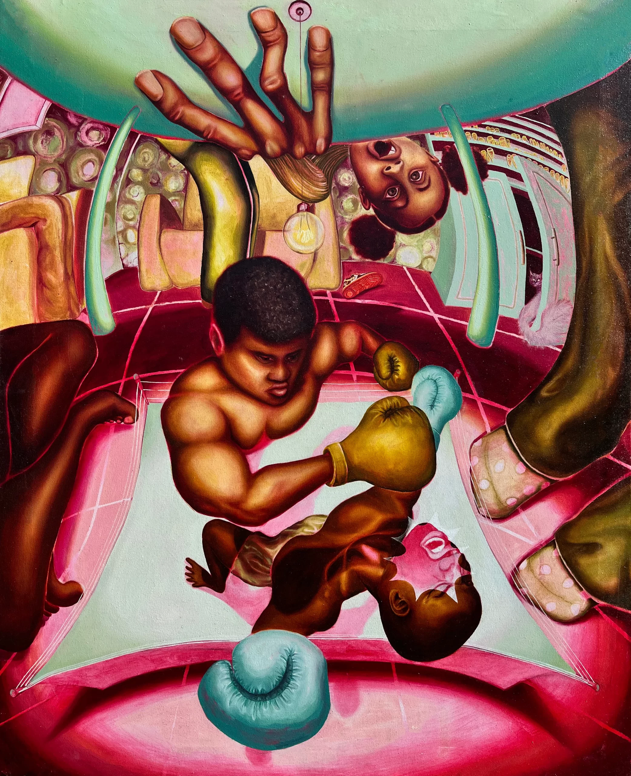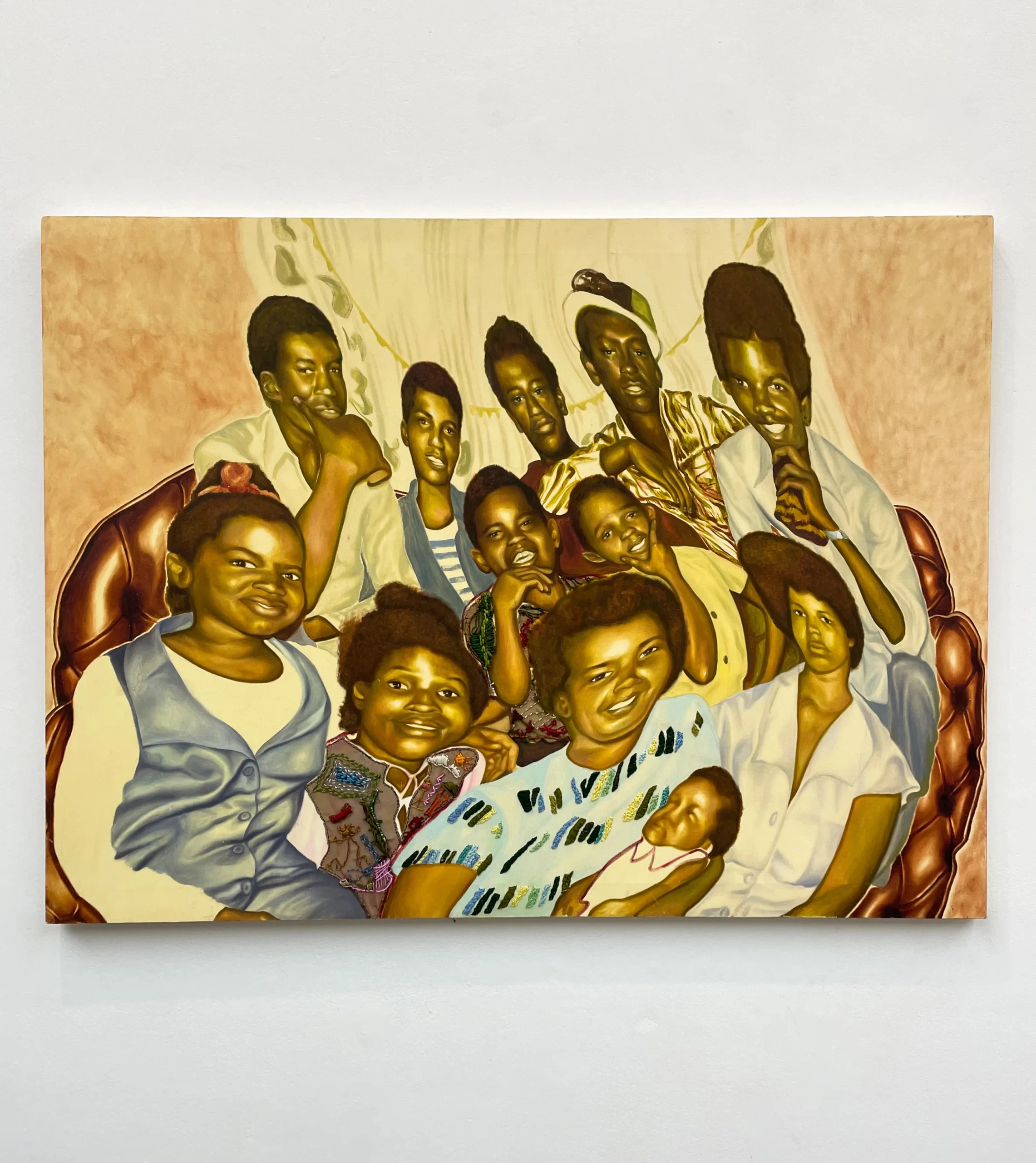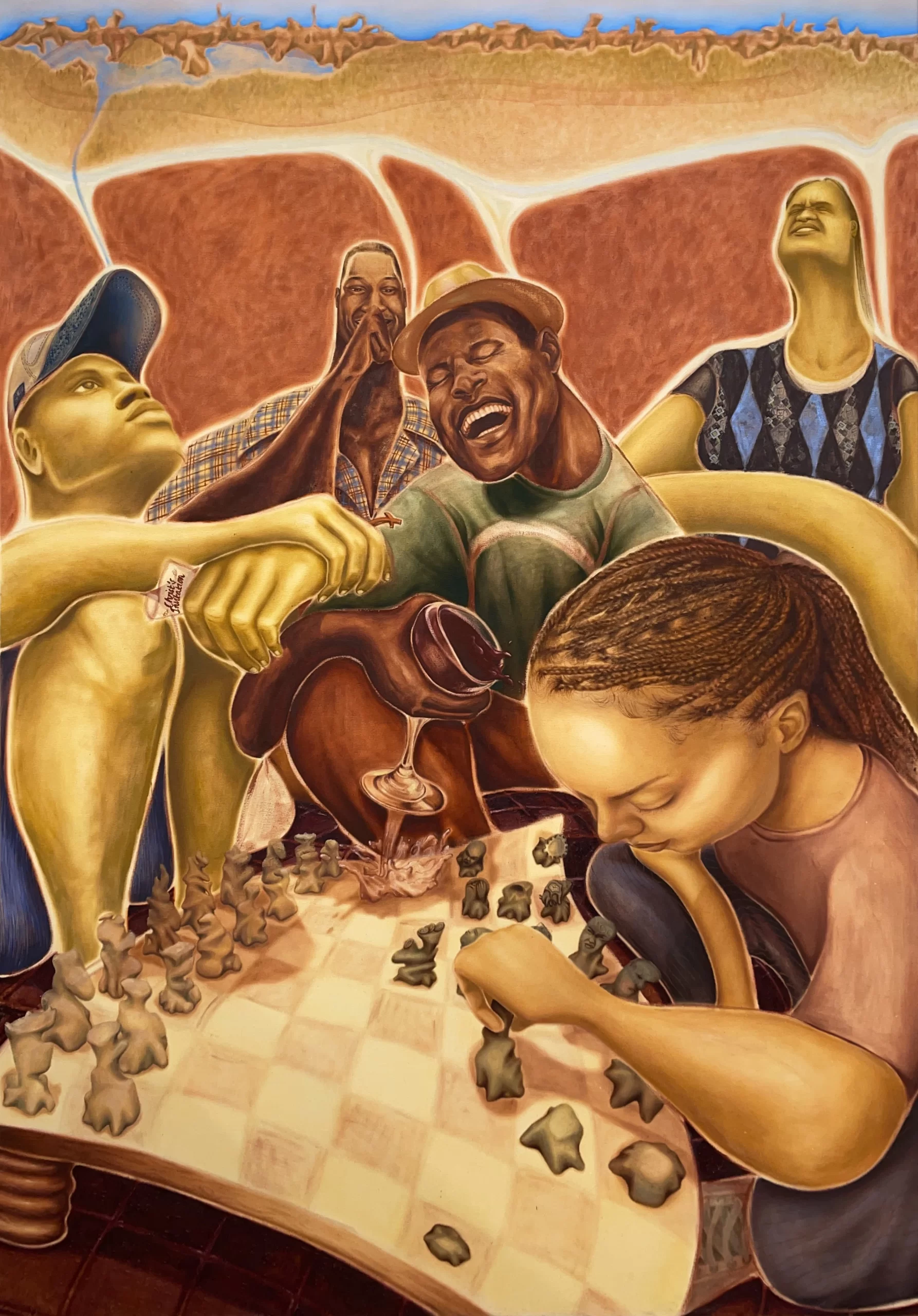 Em suas pinturas grandes e ricas em camadas, a artista Georgia Semple explora temas de “identidade, fé, vício e conexão.” Inicialmente se voltando para a arte como uma ferramenta para explorar sua herança guianense, muitas das telas da artista acabaram capturando algo entre realidade e ficção. Seus retratos visualmente distorcidos detalham “cenas imaginadas de comunidades negras que misturam arquivos familiares com narrativas culturais mais amplas ”, ela revela. Cada uma de suas figuras distorcidas tem um papel específico – “espelhar a tensão entre percepção e realidade.”