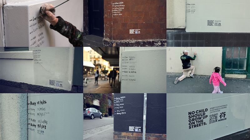 As marcas de altura das crianças, geralmente encontradas nas paredes ou portas das casas das famílias pelo mundo, estão aparecendo em lugares inesperados por toda a Austrália. Se trata de uma campanha pro bono da agência Droga5 para a organização beneficente We Are Mobilise, com o objetivo de chamar a atenção para a crise nacional de moradores de rua durante o Dia da Conscientização sobre a Situação de Rua entre Jovens.