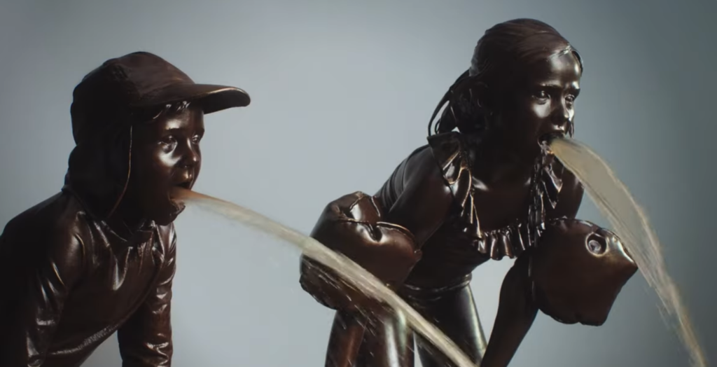 Uma fonte com estátuas que imitam bronze na margem sul do rio Tâmisa, em Londres, é uma obra clássica em todos os sentidos – exceto pelo fato de que essas estátuas jorram uma água turva e repugnante. A instalação, intitulada “The Fountain of Filth” (A Fonte da Sujeira), da agência 4creative e da produtora Glue Society, promove uma nova série de drama factual do canal Channel 4.