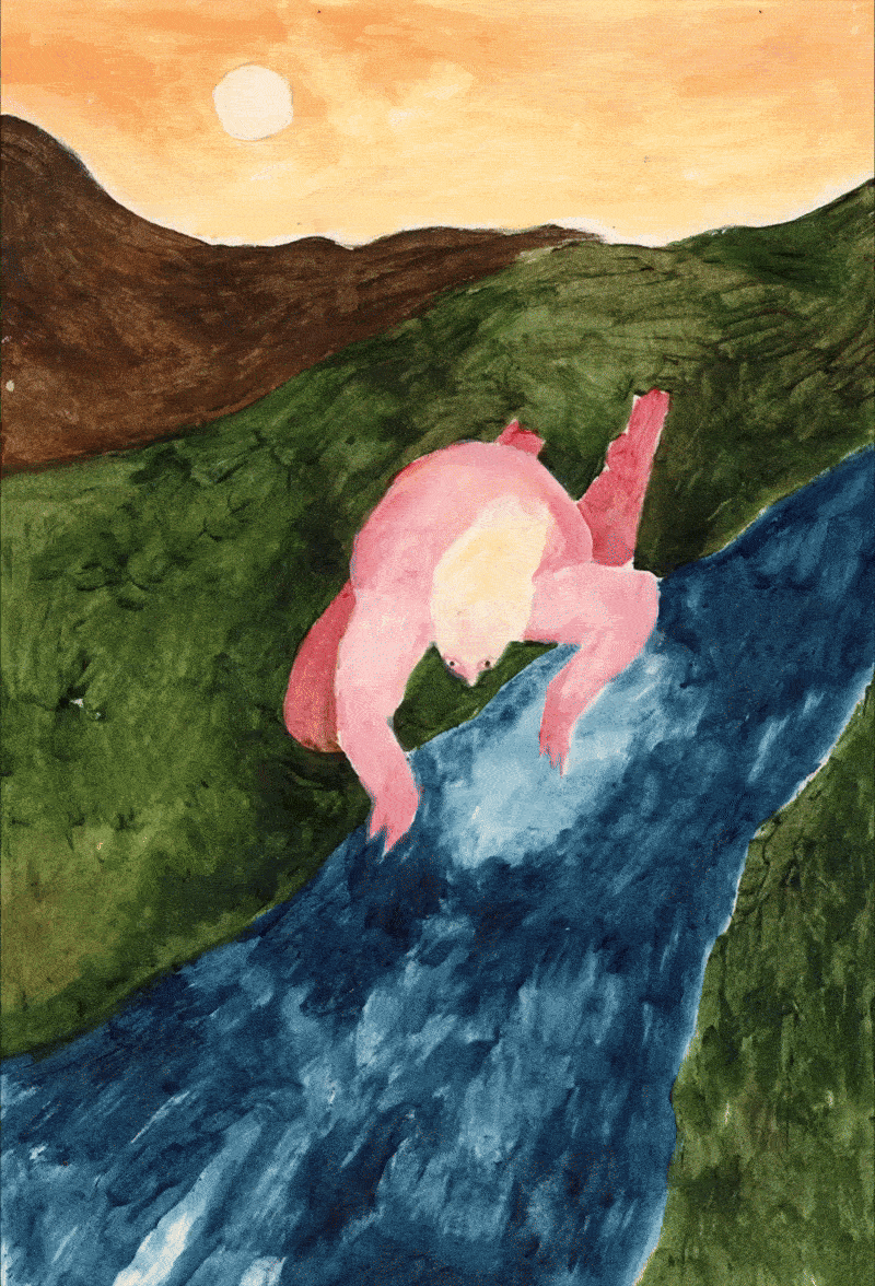 A prática de Weronika Marianna transita entre o desenho, a pintura e, mais recentemente, a animação. Depois de, de forma bastante impulsiva, criar uma sequência quadro a quadro de uma figura animada se fundindo a uma paisagem montanhosa usando tinta sobre papel há alguns anos, a artista iniciou sua jornada na animação analógica, que, segundo ela, é “um buraco sem fundo do qual nunca quero sair”.