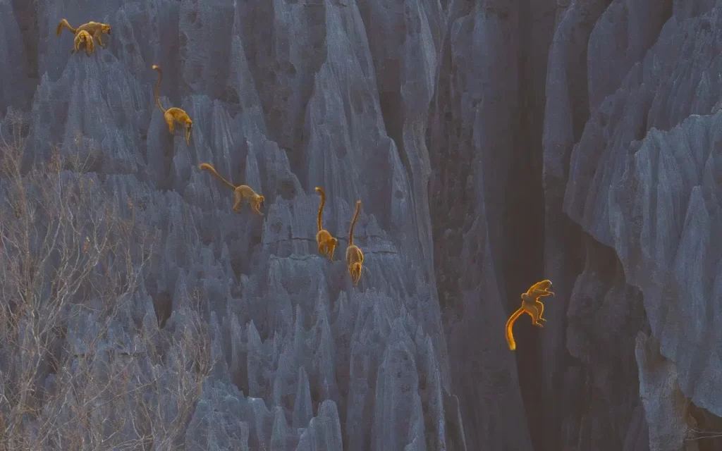 Um lêmure ousado em busca de alimento rendeu a Zhou Donglin a maior honraria no Concurso de Fotografia BigPicture de 2025. Fotografado em Madagascar no final da estação seca, o animal corajoso leva seu filhote para o passeio, saltando sobre uma ravina para garantir que seu filhote seja alimentado. São imagens como esta que definem o concurso, agora em seu 12º ano. Promovido pela Academia de Ciências da Califórnia e presidido pela fotógrafa de vida selvagem Suzi Eszterhas, as imagens vencedoras compartilham trechos raros do mundo natural.
