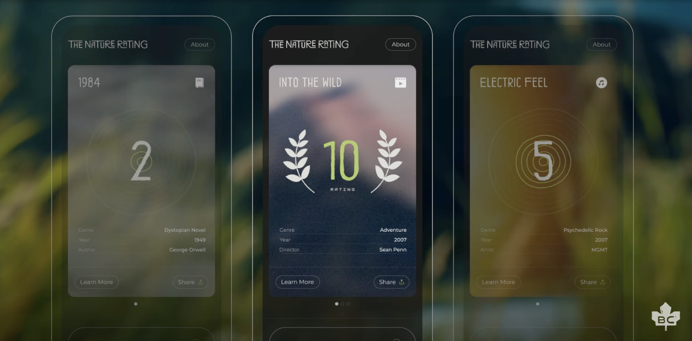 A Colúmbia Britânica é uma bela região, repleta de atrações. Fazer com que o público mais jovem, de costumes urbanos, se envolva com isso não é tarefa fácil. A agência Zulu Alpha Kilo de Toronto encarou o desafio. Como partes de um novo lançamento da marca global, eles criaram o projeto The Nature Rating, a ferramenta digital que analisa a mídia que você consome (ou está considerando) para ajudar a trazer conscientemente mais a vida diária da natureza.