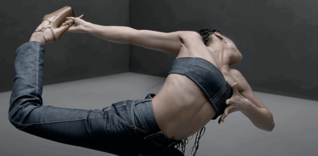No coração de Anatomic Denim está uma campanha cinematográfica e fotográfica do diretor cult Jordan Hemingway, conhecido por seu estilo visceral e colaborações com Gucci, Prada e Maison Margiela. As imagens apresentam atletas de ginástica, pole dance, ciclismo e calistenia, mas sem todos os seus aparelhos habituais. Sem argolas, sem pole dance, sem bicicleta. O que resta é o corpo humano em movimento, vestido com um jeans projetado para se mover com ele. Bacana.